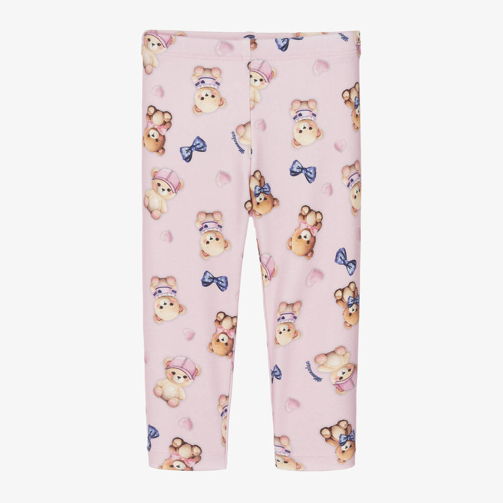 Pink full length leggings for younger girls by Italian label Monnalisa, made from beautifully soft and stretchy viscose jersey. They are patterned with cute teddy bears, hearts and bows and have the brand's logo subtly incorporated throughout the design. The waistband is gently elasticated to ensure a comfortable fit.