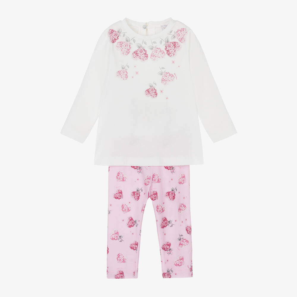 In off-white and pink, this sweet top and leggings set for little girls is by Monnalisa. Both pieces are made in soft cotton jersey and patterned in pretty flowery hearts, subtly incorporating the designer's signature logo. The long-sleeved top has a keyhole button fastening on the back, and the full length leggings have a gently elasticated waist for a comfortable fit.