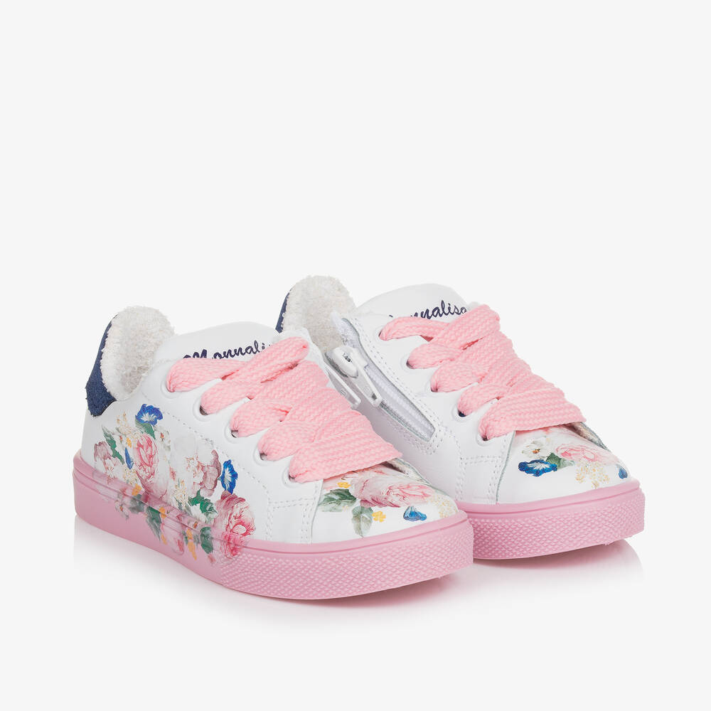 Pink and white trainers for girls by Monnalisa, printed with a pretty floral pattern. Made from smooth leather with a lightly padded insole, they have towelling lining for added comfort and a non-slip rubber outsole. Fastening with a side zip and wide woven laces, they have a navy blue velvet panel on the heel for an added element of contrast.
