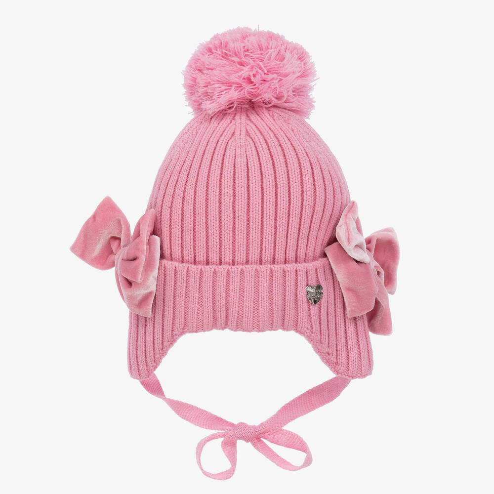 Pink bobble hat for girls by Monnalisa, knitted in a chunky ribbed wool blend. Warm and cosy, it has a soft jersey lining for comfort. The turned up brim has pretty velour bows on the sides and a heart-shaped silver metal logo charm on the front. There is an attached strap under the chin and a large pom-pom on the top.