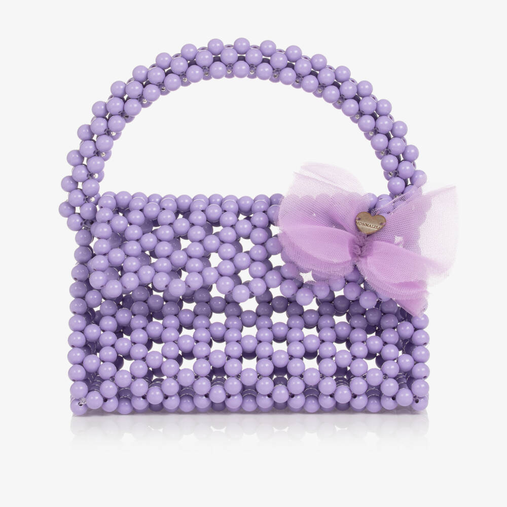Girls purple beaded handbag by Monnalisa. This fun accessory by the luxury Italian brand has a firm structure and a chunky handle, with a flap to close over the top that is decorated with a tulle floral appliqué.