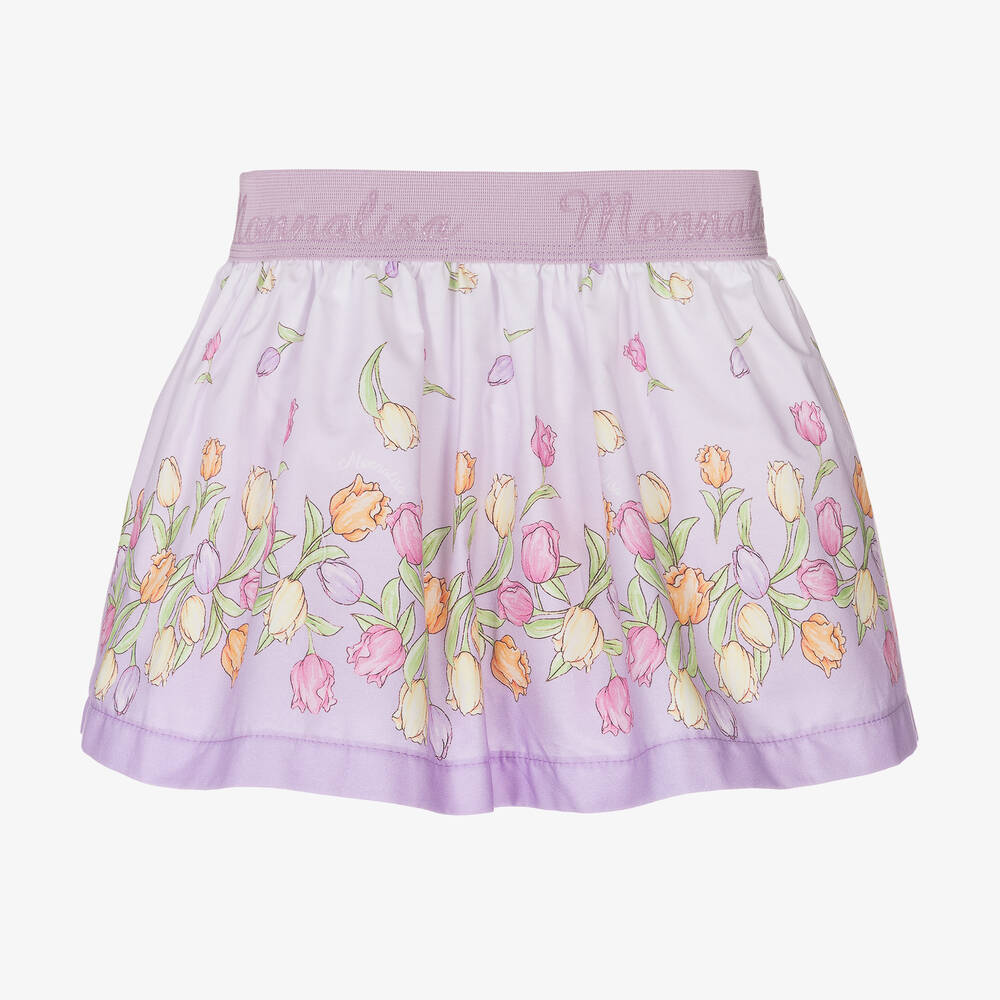 Stunning lilac purple and white skirt for little girls by Monnalisa, made in lightweight cotton poplin. In an ombré design, it has a colourful tulip print throughout, with subtle white script logo detailing. There is an elasticated logo waist and a soft voile lining for superior comfort.