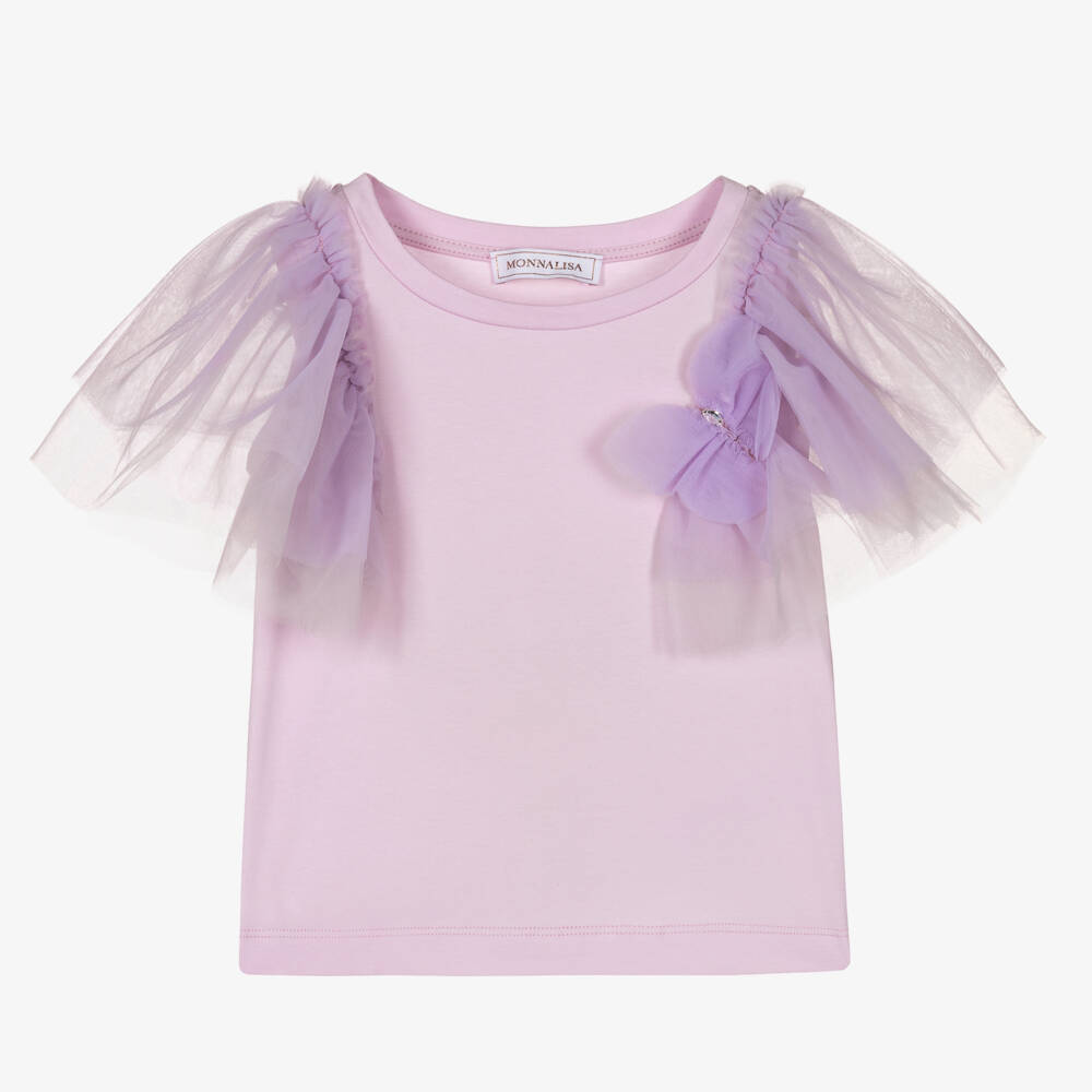 A beautiful lilac purple T-shirt for girls from Italian brand Monnalisa. This cotton jersey statement top has dramatic sleeves made with layers of ruffled soft tulle in tonal purple. A matching tulle butterfly appliqué with sparkly crystal detail gives it a lovely finishing touch.