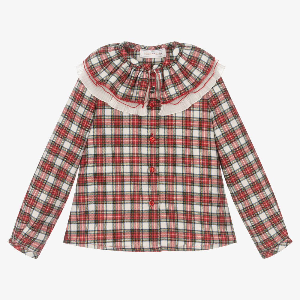 Pretty red tartan blouse for girls by Italian designer Monnalisa. It has a large ruffled collar layered with white tulle edged in red stitching and pleated white voile. Made in easy-to-care-for polycotton twill, it fastens with logo buttons on the front and cuffs.