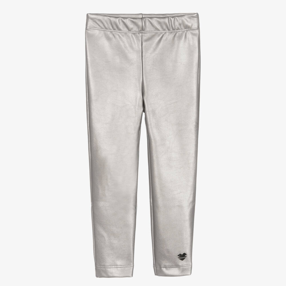 Stylish silver leather-look leggings for girls, by Monnalisa, with a silver heart-shaped logo charm on one leg. Soft and stretchy, they are full length and add an edgy twist to any outfit they are styled with.