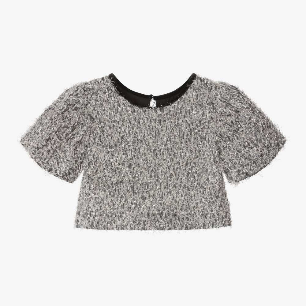 Great for parties, this metallic silver T-shirt by Monnalisa Chic is designed for girls. Sitting higher on the waist, this cropped style is textured with lurex fringing and woven with sparkly thread for extra shimmer. Fastening with a keyhole cut-out on the back, it has short puff sleeves and a narrow black velvet trim on the neckline.