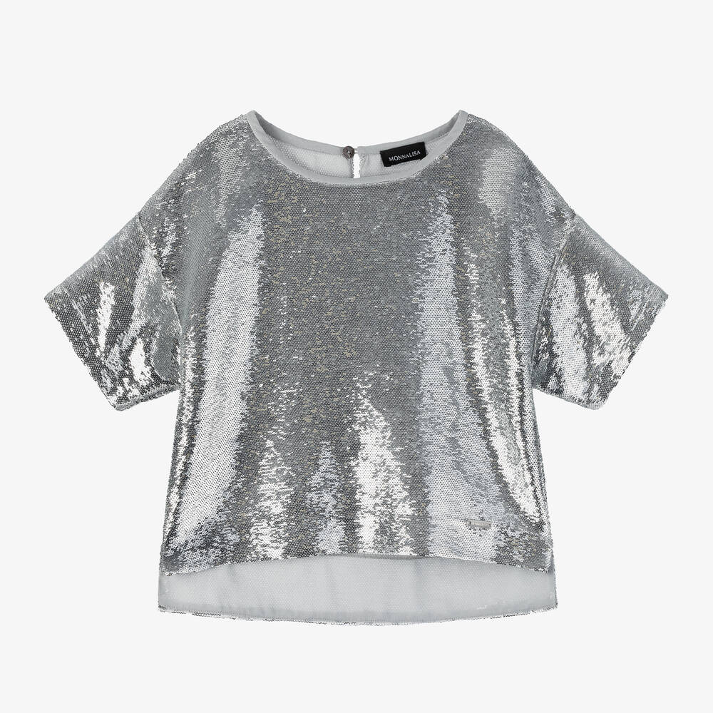Sparkling silver top for girls by Monnalisa, covered in dazzling sequins. Adding instant glamorous impact to any look, this short-sleeved style has a longer hem at the back and a shiny silver logo charm on the front. It fastens with a stylish keyhole button on the back, and is lined in lightweight mesh for comfort.