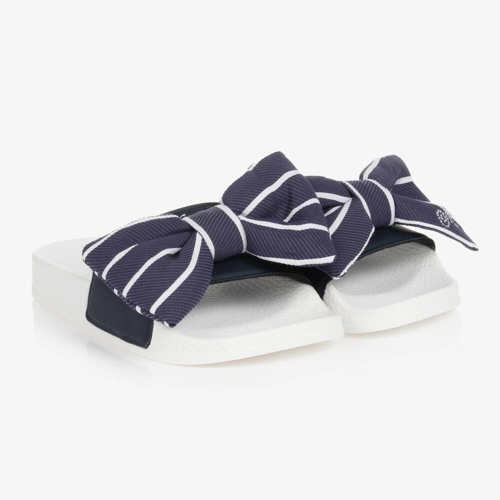 A gorgeous pair of navy blue and white sliders for girls, by Italian brand Monnalisa. An eye-catching stripe bow is decorated on top of the rubber strap, detailed with a diamanté logo for added glamour. These shoes slip-on effortlessly, with a soft textile lining and a contoured insole. They are comfortably finished with a non-slip rubber outsole.