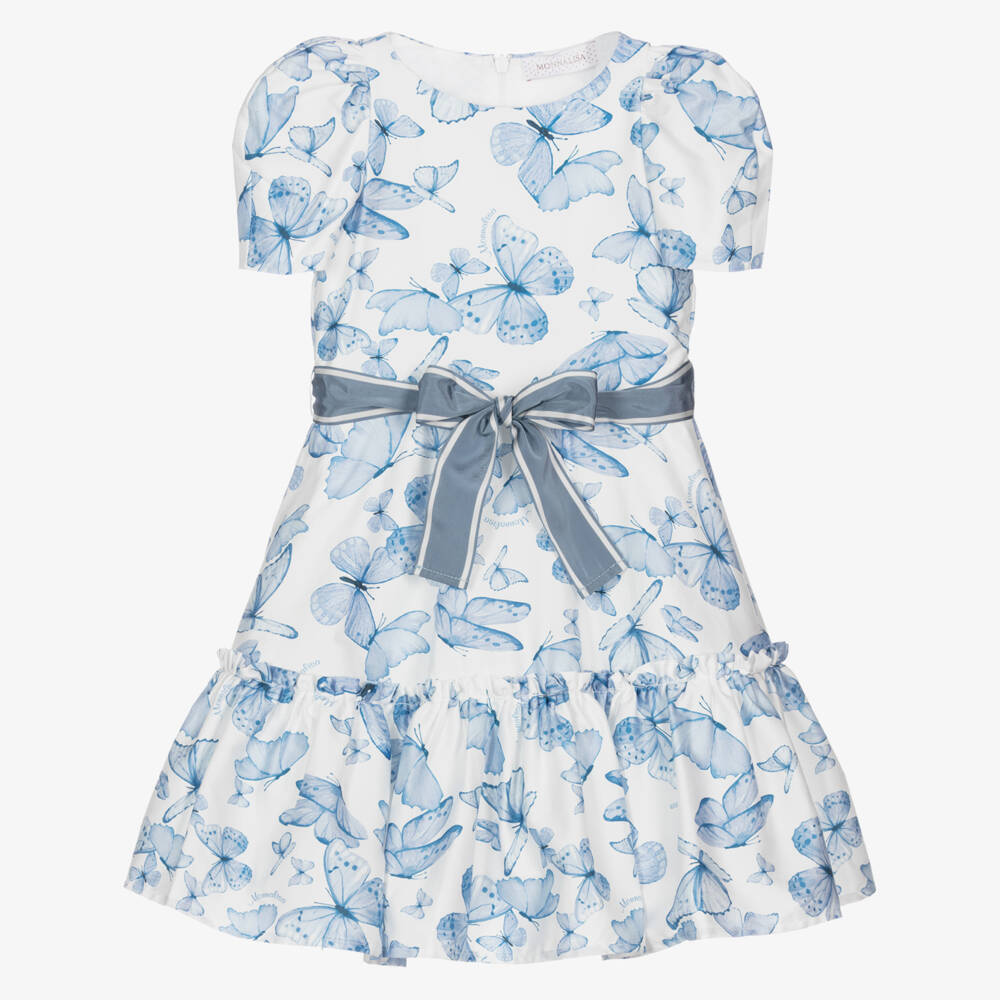 The ideal summer party or special occasion dress, this gorgeous white cotton dress for girls is by Monnalisa, with a beautiful blue butterfly and logo print. It has a stylish silhouette, with structured, puffed sleeves, a stylish, detachable, grosgrain ribbon sash that ties in a large bow and a deep frill around the hemline. A mesh ruffle around the voile lining adds lots of volume and pizazz.