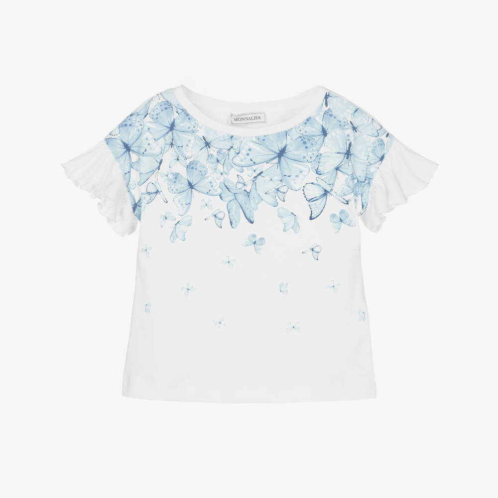 Pretty white cotton T-shirt for girls by Monnalisa, printed with beautiful blue butterflies cascading down the front. Made in soft, comfortable jersey, it has dropped shoulders embellished with chiffon ruffles.