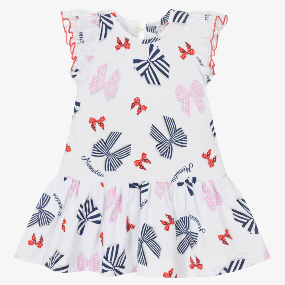 Pretty white cotton dress for little girls by Italian brand Monnalisa. Made in comfortable jersey, it has a bold pattern of pink, navy blue and red bows with logos. There are cute ruffles over the shoulders, one made in lightweight voile with red embroidered trims. The dress fastens with a keyhole button fastening around the back.