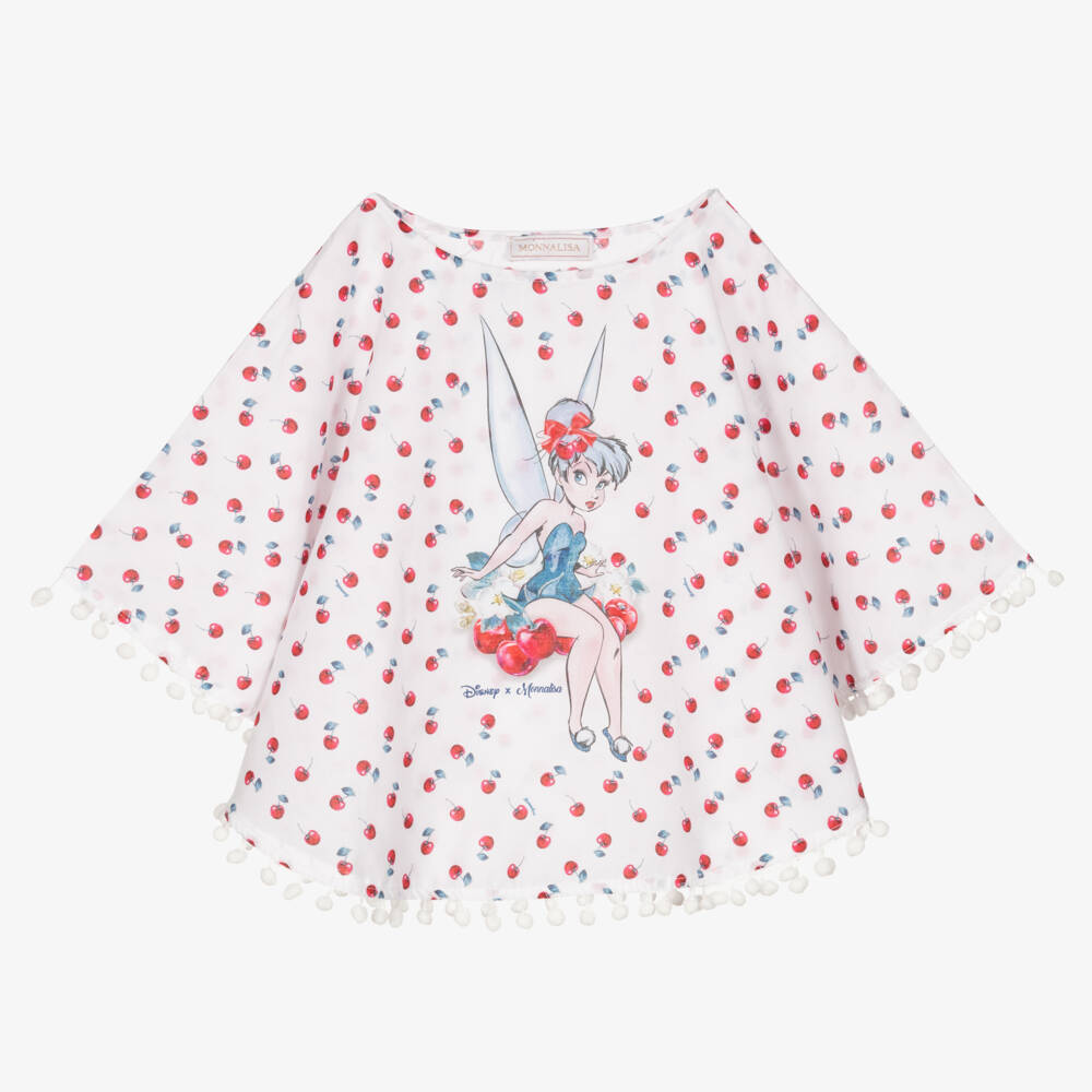 Flowy white beach cover-up for girls by Italian designer Monnalisa, made in soft and lightweight cotton voile. Ideal for strolling on the beach or relaxing by the pool, this cute kaftan has an all-over cherry design with Tinker Bell printed on the front. It is trimmed with red pom-poms for added statement and style.