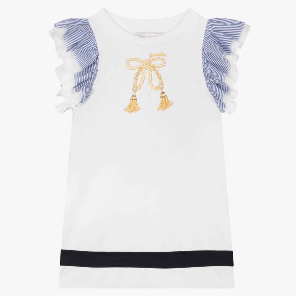 A lovely, nautical-themed white cotton jersey dress for girls by Monnalisa. Stylishly casual, it has beautifully ruffled cotton sleeves in navy blue and white stripes over a plain white voile. The front has a sweet embroidered bow and logo in gold with diamanté and faux pearl appliqués for a touch of sparkle.