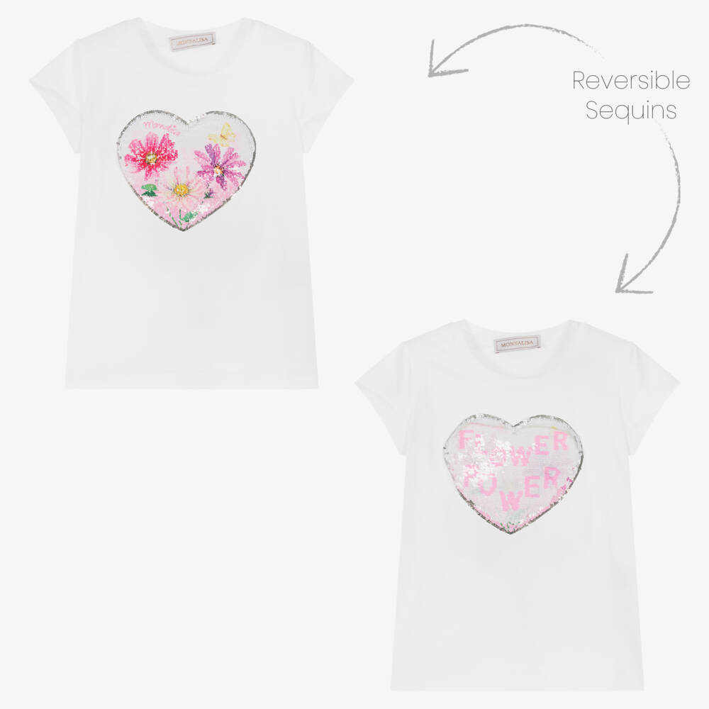 A casual white T-shirt for girls by Italian brand Monnalisa, made from luxuriously soft cotton jersey. Adding a playful girly touch, the bodice is decorated in a reversible sequined heart, with a floral design on one side and a 'flower power' slogan on the other.