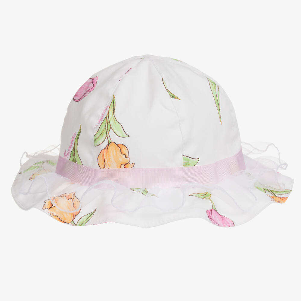 A sweet white sun hat for little girls by Italian brand Monnalisa, made in soft and lightweight cotton. Designed in a colourful tulip print, it has a pink grosgrain ribbon with a bow at the back and a tulle ruffle trim for a pretty finishing touch. The brim surrounds the head and helps protect skin and eyes from the sun.