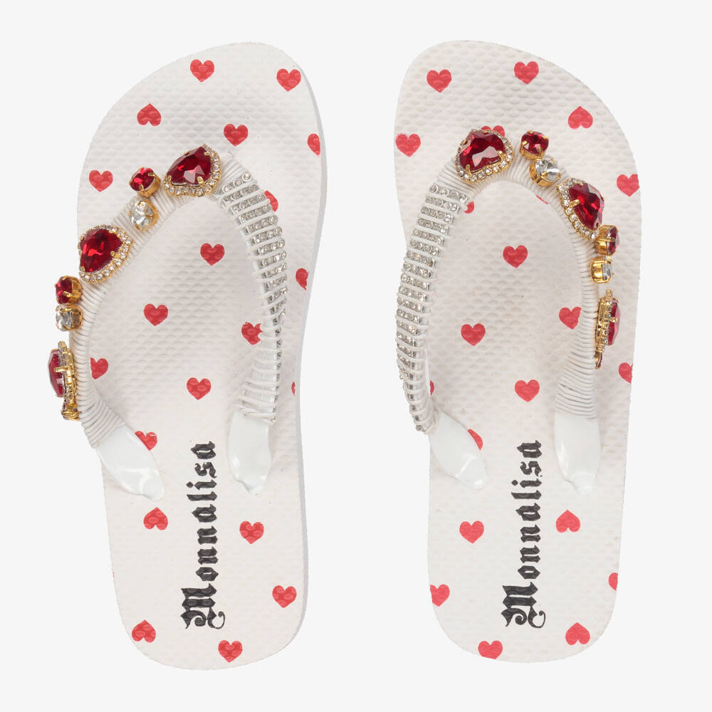 Girls white flip flops by Monnalisa, made in soft rubber. Ideal for the beach or by the pool, they have white rubber straps trimmed red heart-shaped gems and silver diamantés. They have soles printed with red hearts and non-slip rubber outer soles.