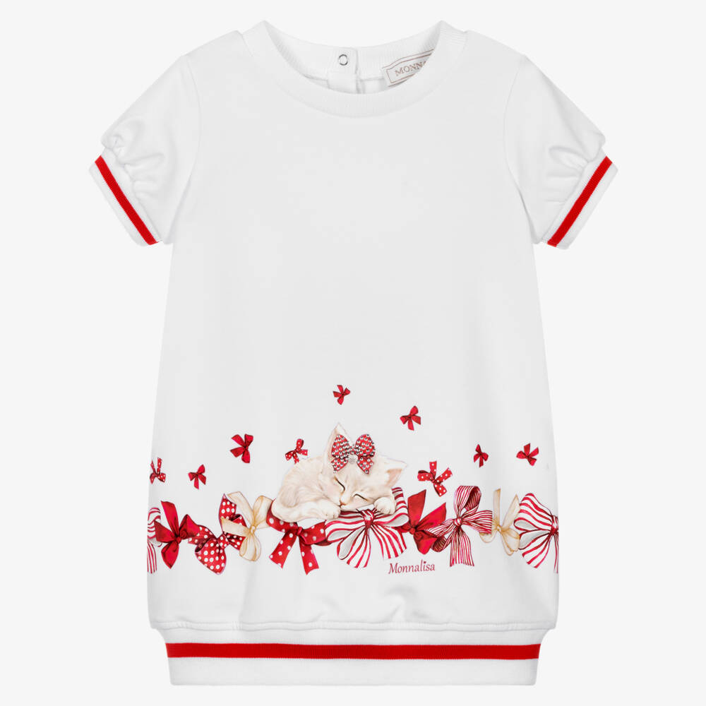 Comfortable for little girls, a white cotton jersey dress by Monnalisa. The front is printed with an adorable kitten sleeping on a bed of beautiful red bows. It has ribbed trims with red stripes and easy-fastening poppers on the back to pull it on over the head.