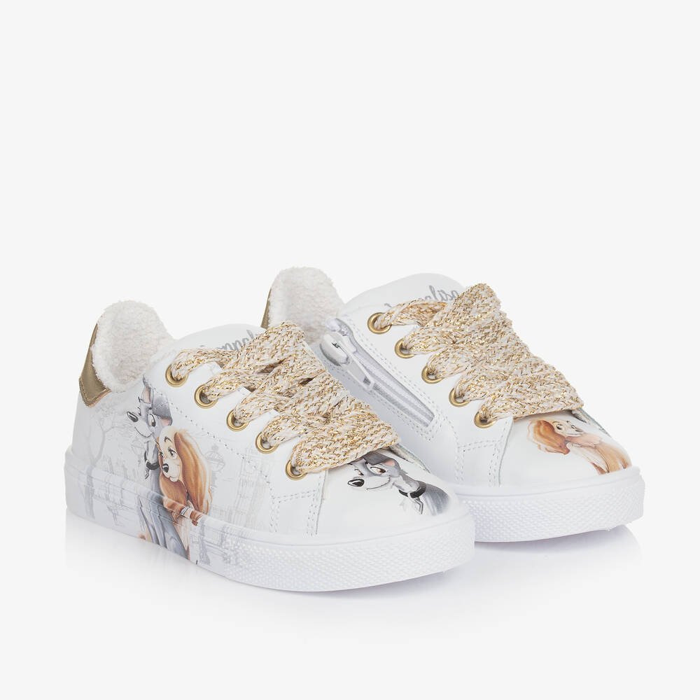 Lovely white trainers for girls by Monnalisa, made from smooth leather. Designed in collaboration with Disney, they are printed with their iconic Lady & The Tramp characters for a fun look. Fastening with side zips and sparkly gold wide woven laces, they have shiny gold panels on the heels for added glamour. Lined in soft towelling, they have lightly padded leather insoles and non-slip rubber outsoles for good grip.