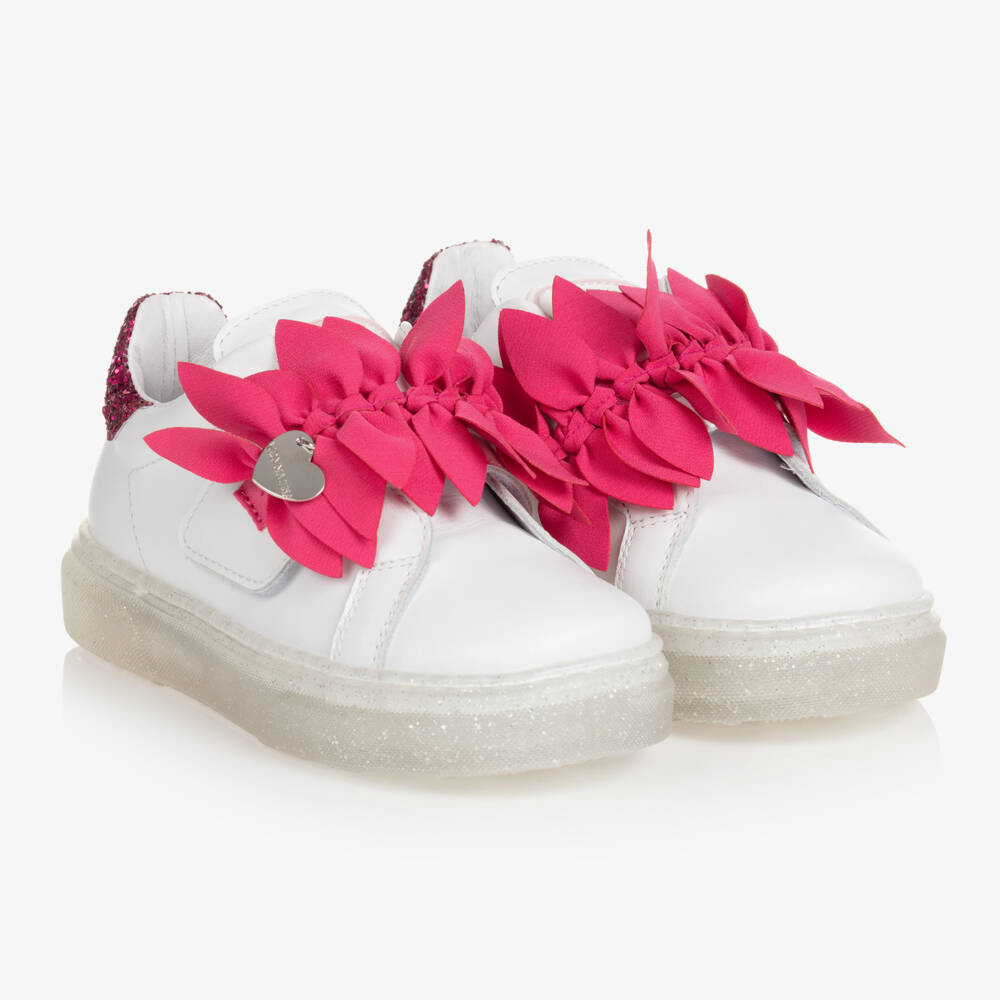 Girls white and pink petal sneakers by luxury Italian brand, Monnalisa. Made in premium quality leather, they have a fuchsia pink glitter heel trim and a feature velcro strap decorated with pink fabric petals and a silver logo heart charm. Fully lined in leather with a padded leather inner sole, the outer soles are made in clear rubber with a silver glitter finish and are non-slip underneath for a sure grip.