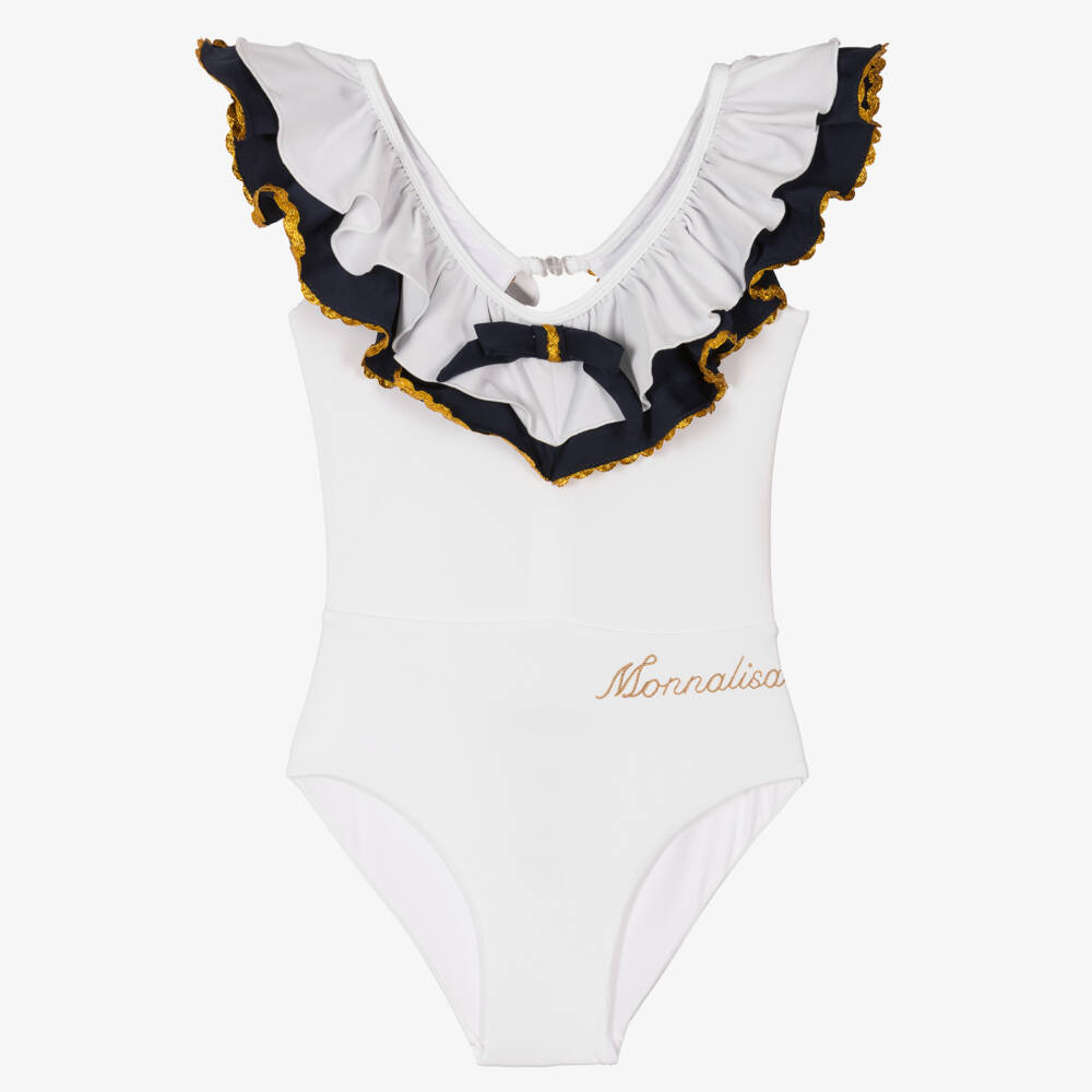 By Italian brand Monnalisa, a swimsuit for girls in white and navy blue nautical tones. This sophisticated, open-back style is highlighted with shimmery gold ric rac ribbon trims and a matching bow on the ruffled neckline. Silky smooth and fully lined for comfort, it fastens with a clasp on the back of the neck. For an added luxury touch, a gold logo script is printed on the front.