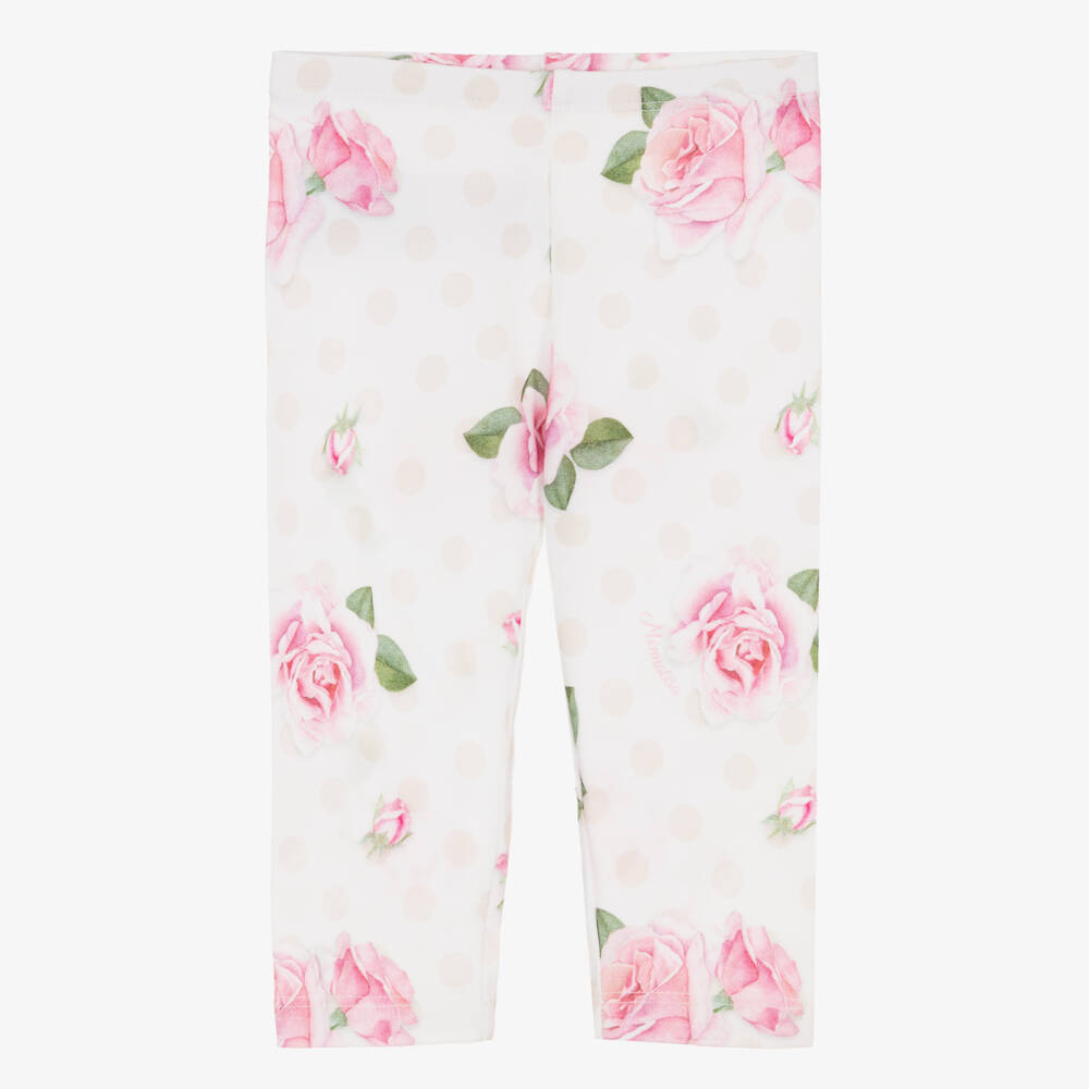 Pretty white leggings for little girls by Italian brand Monnalisa, with a feminine pattern of pink roses, logos and beige polka dots. Full length, they are made in comfortable jersey with a gently elasticated waist for a comfortable fit.