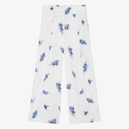 These white cotton trousers for girls by Monnalisa, showcase a beautiful pink and red floral pattern. Soft and lightweight, they are styled in a wide leg silhouette with a gentle stretch for comfort. Fastening with a branded button and zip, they have a partially elasticated waistband for a comfortable fit and useful front pockets.