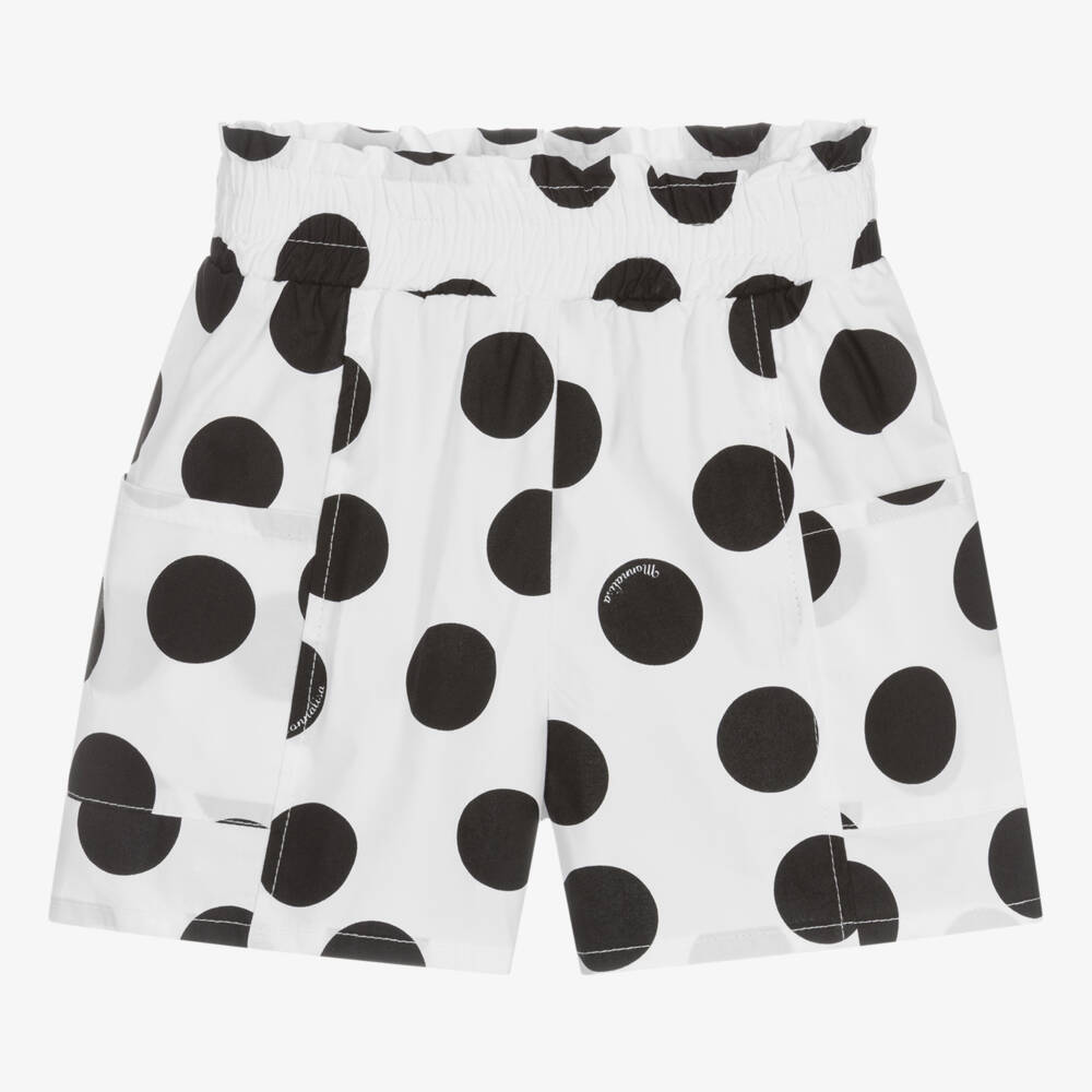 Beautiful white polka dot shorts for girls by Italian designer Monnalisa, made in the softest cotton poplin. Effortlessly chic, they have an elasticated paperpag waist and patch pockets on the front.
