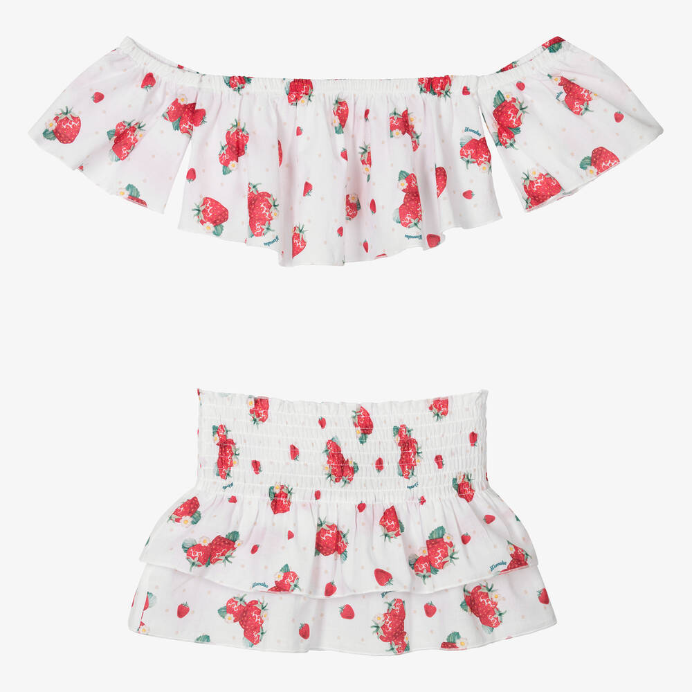 A delightful white skirt set for girls by Monnalisa, made from soft and lightweight cotton. It has a red strawberry pattern with a ruffled trims for a playful look. The cropped top can be worn in an off-the-shoulder bardot style, and the matching skirt has a pretty shirred waistband.