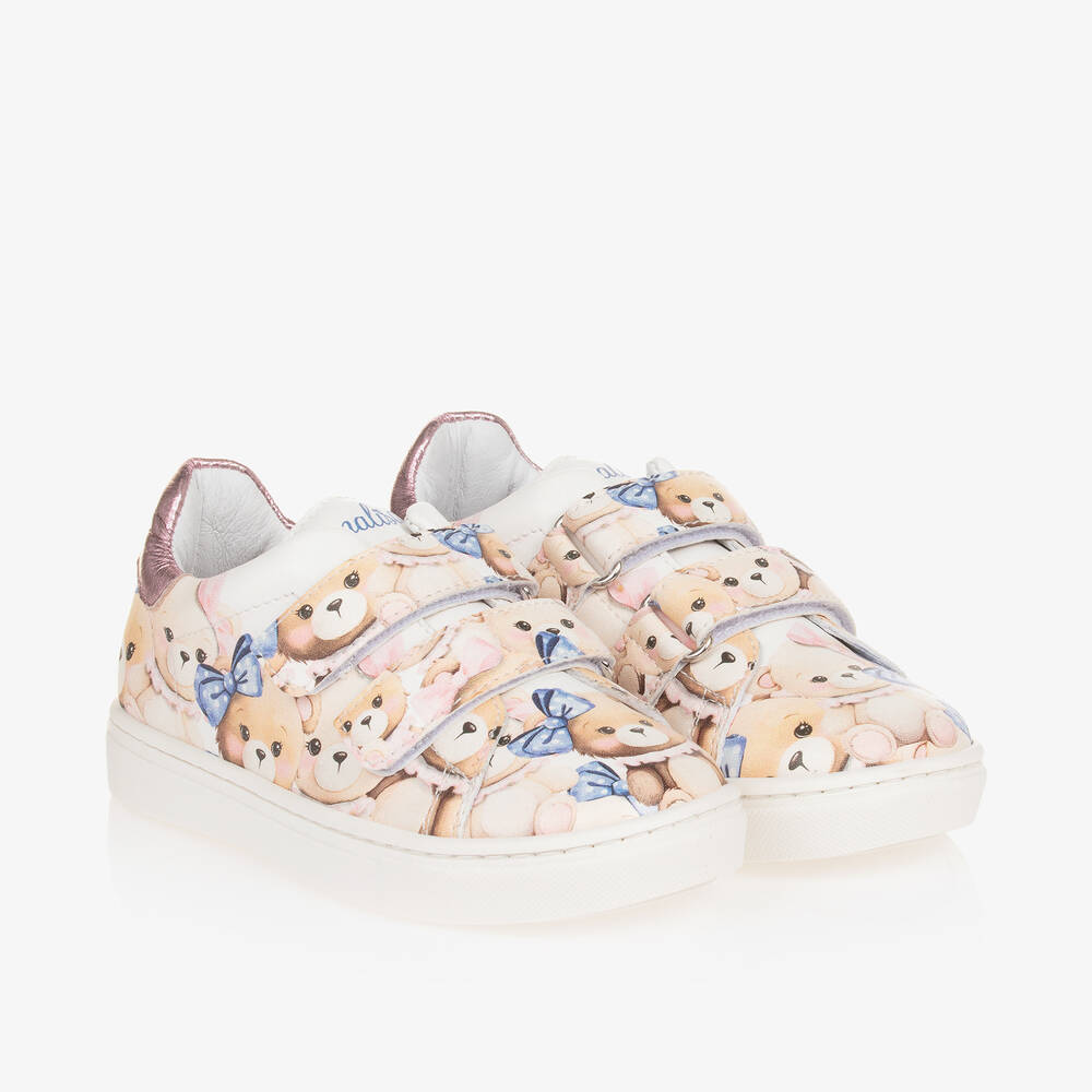White trainers for little girls from Italian label Monnalisa, made in soft faux leather. These adorable shoes are patterned with beige blushing teddy bears, blue bows, and pink details. The brand's name features on the tongue and the heel is metallic pink for added shimmer. They have a comfortable leather lining and insole, easy-fastening velcro straps, and non-slip rubber sole.