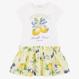 This playful white and yellow dress for girls by Monnalisa features a cool Amalfi Coast theme. The bodice is made in soft cotton jersey for comfortable wear, with a bold print of lemons and 'Positano' in sparkly diamanté letters. The skirt is made in smooth cotton poplin with a vibrant lemon and holiday-themed print.