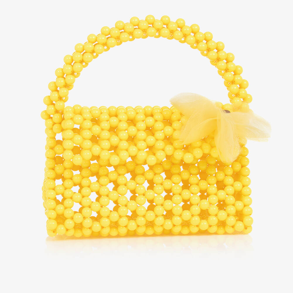 Girls bright yellow beaded handbag by Monnalisa. This fun accessory by the luxury Italian brand has a firm structure and a chunky handle, with a flap to close over the top that is decorated with a tulle floral appliqué.