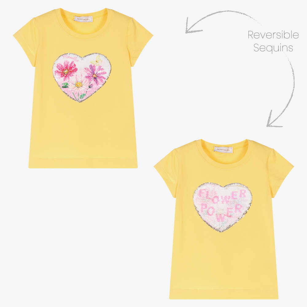A casual yellow T-shirt for girls by Italian brand Monnalisa, made from luxuriously soft cotton jersey. Adding a playful girly touch, the bodice is decorated in a reversible sequined heart, with a floral design on one side and a 'flower power' slogan on the other.