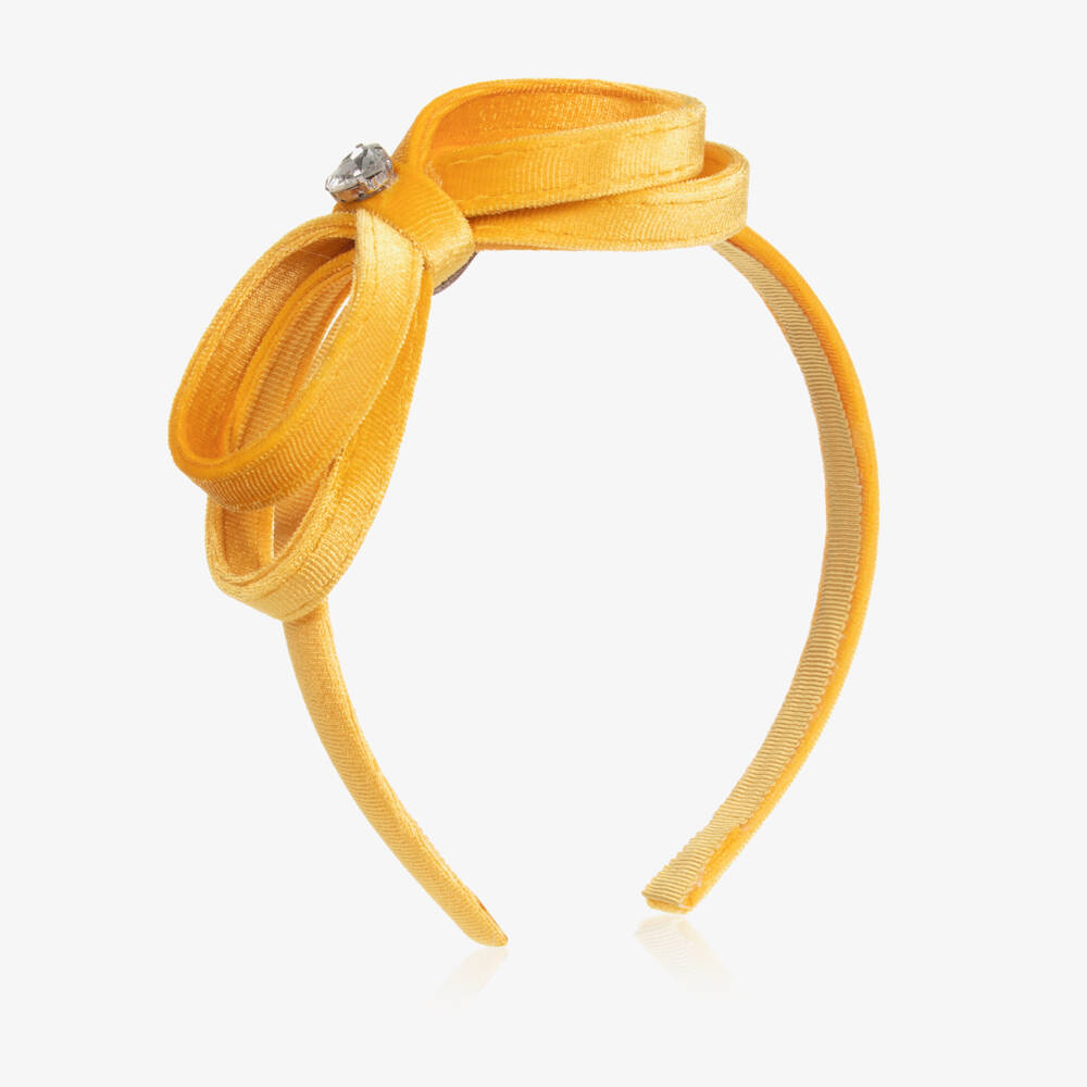 Yellow velvet hairband for girls by Italian brand Monnalisa. A lovely finishing touch to any outfit, this soft and flexible band has a sweet bow on the top with a crystal heart in the centre.
