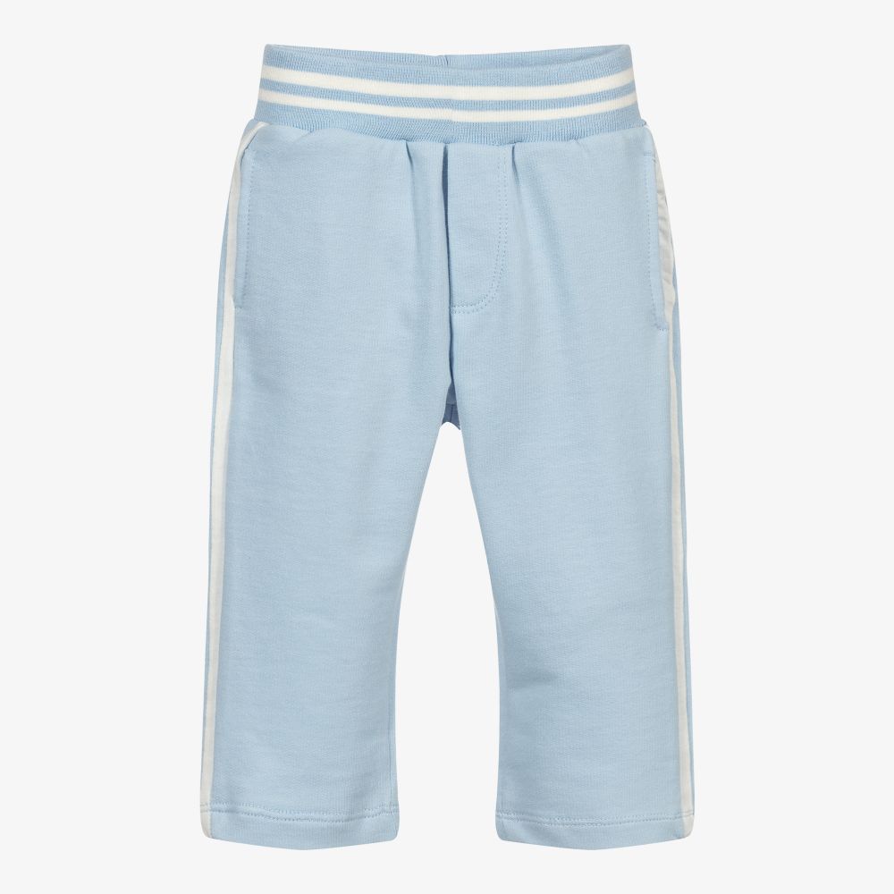 Younger boys pale blue joggers from Monnalisa, made in lightweight cotton sweatshirt jersey. They have white stripes on the stretchy, ribbed waistband and white stripes along the side seams. There are useful side pockets and a faux back pocket with white logo print.