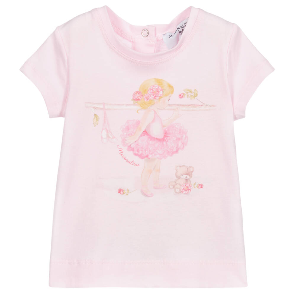 Little girls pink cotton T-shirt by Monnalisa, with an adorable pink ballerina print. Made from soft and stretchy jersey, it fastens with poppers on the back.