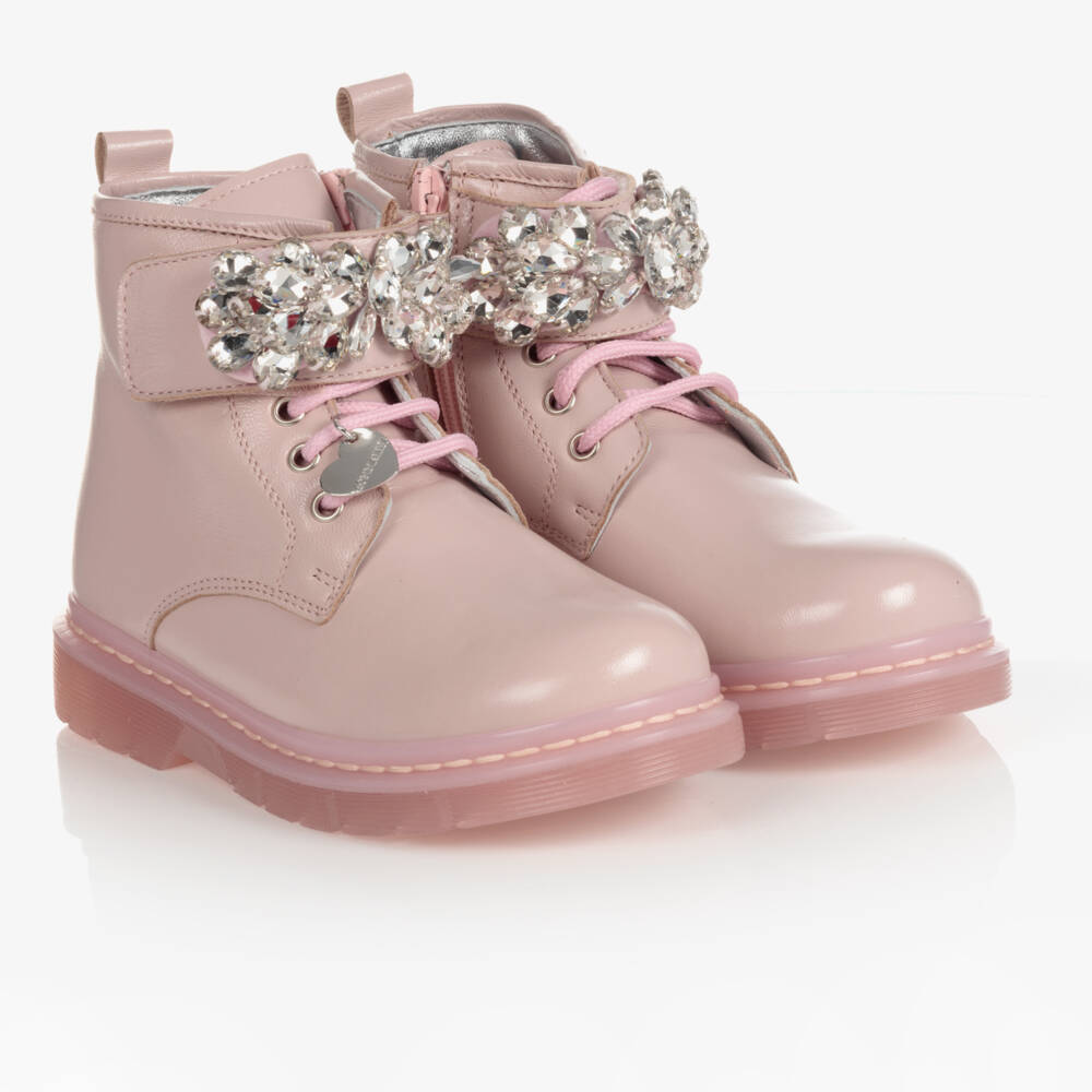 Cute pink patent leather boots for girls by Monnalisa, fastening with a side zip, laces and velcro strap across the foot. There is a sweet silver heart logo charm on the uppers, along with a sparkly rhinestone decoration on the strap. They have a silver leather insole for comfort and a pink non-slip rubber sole for added grip.