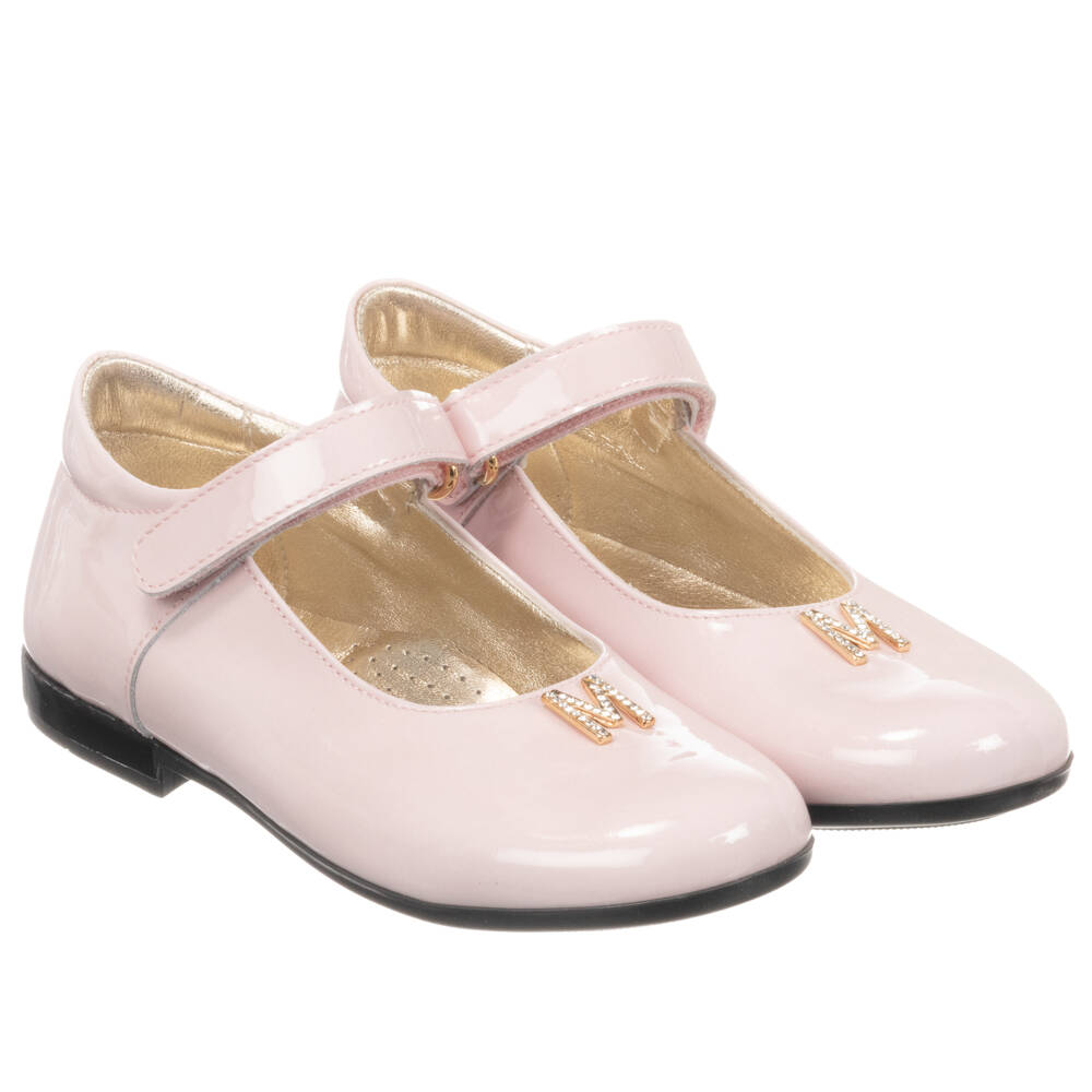 Smart pink shoes for girls by Italian designer Monnalisa. Made in smooth patent leather, they sparkle with the brand's diamanté logo on the front and fasten with easy-to-use velcro straps. They are lined in silver leather and have non-sip, rubber soles.