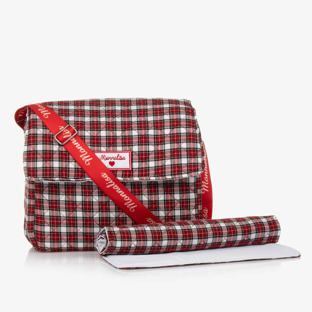 A quilted changing bag by Monnalisa, designed in a red, white and black tartan pattern with diamond-shaped stitching. This roomy design has a lined interior with five useful pockets. The main compartment fastens with a zip and it has an additional velcro flap over the top for added security. The red shoulder strap, printed with white logos, is fully adjustable for extra convenience. The bag comes with a foldable changing mat in a matching design.