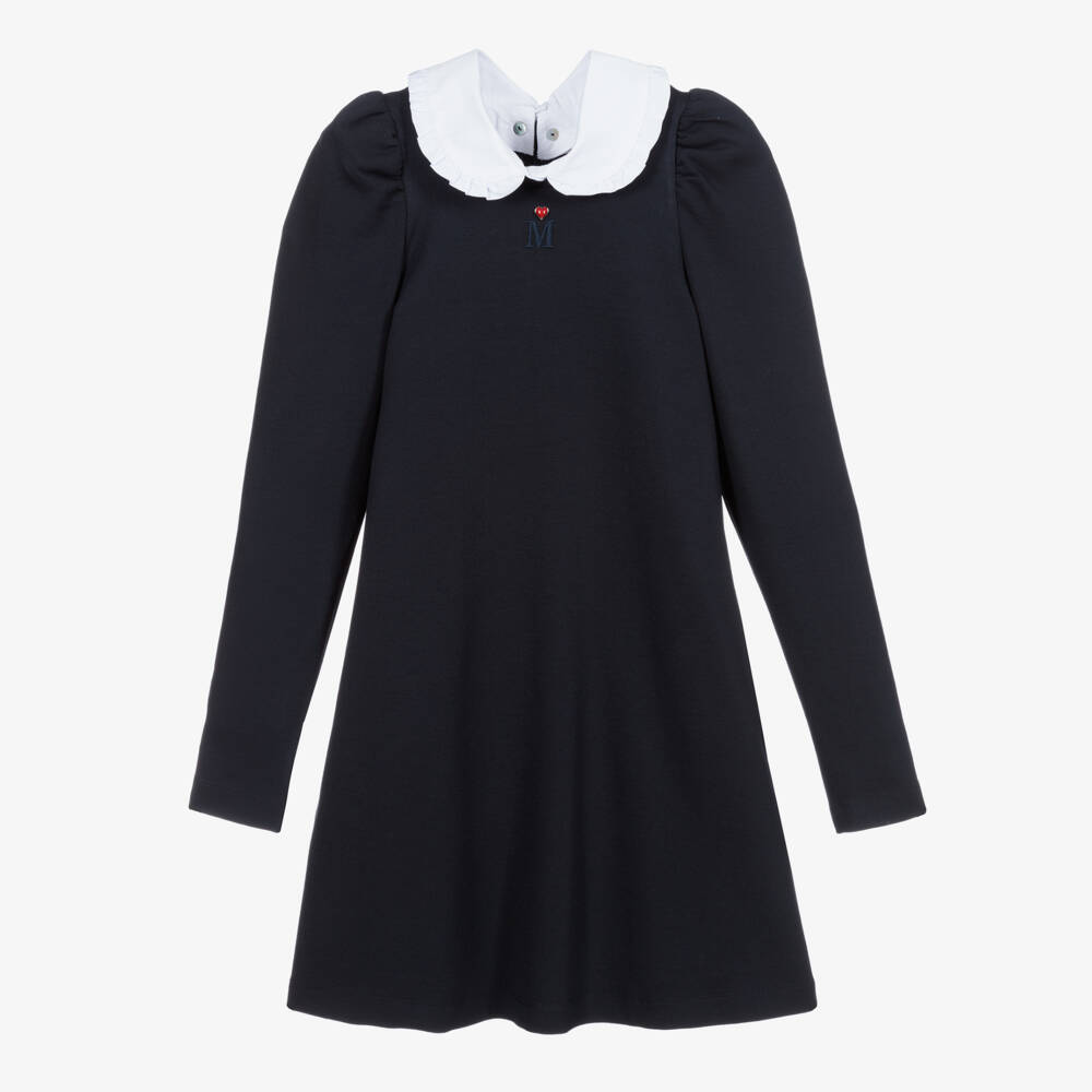 Teen girls navy blue shift dress from Monnalisa, with a ruffle-trimmed white collar. It is made in mid-weight Milano jersey, with a lightweight cotton jersey lining. It has tone-on-tone 'M' logo embroidery and a red heart on the chest. The shoulders are gathered and puffed, and there is a concealed zip fastening on the back.