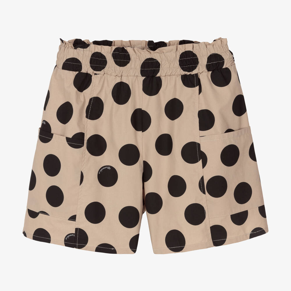 Stand-out beige shorts for teen girls by Italian designer Monnalisa, patterned with large black polka dots, some with a white logo. Effortlessly chic, they are made in lightweight, cotton poplin, with patch pockets on the sides.Fun for everyday casual, they have a comfortable, wide elasticated waistband.