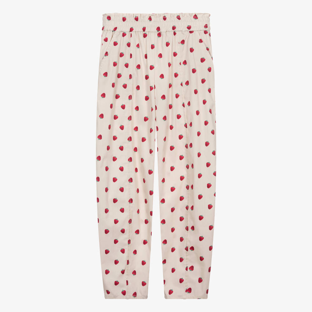 In a light shade of beige, these cotton trousers for teen girls are by Italian designer Monnalisa. Soft to the touch, these tapered trousers are printed with vibrant red strawberries and discreet white script logos. They have seam detailing on the front and back of the leg and handy pockets positioned on the hip. The elasticated, shirred waistband has a ruffle trim at the top, designed to be seen when T-shirts are tucked in.