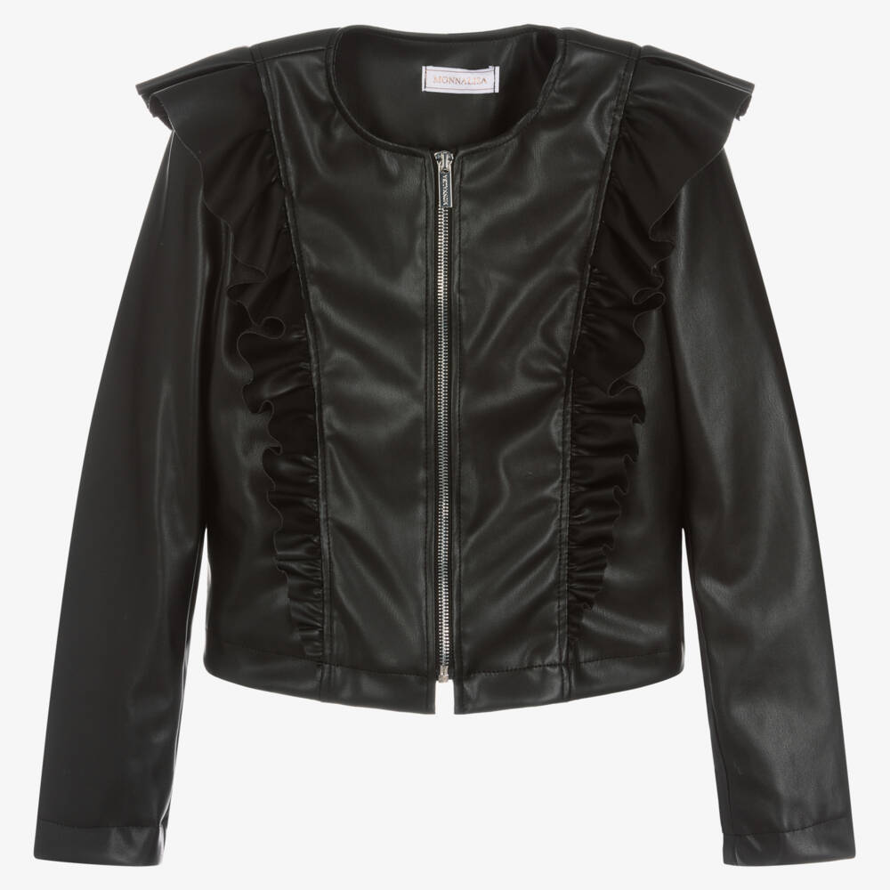 Stylishly sleek, this faux leather jacket for teen girls is from Italian brand, Monnalisa. The shoulders are decorated in ruffled trims, adding feminine charm to this edgy look. It zips-up neatly with silver hardware, and has a silky smooth viscose lining.