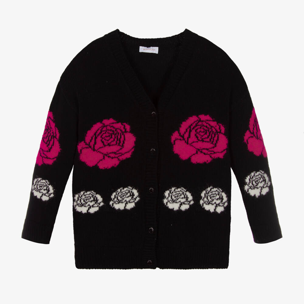 Cool black cardigan for teen girls by Monnalisa Chic, with eye-catching white and pink intarsia roses for a fun finish. The soft mid-weight wool knit provides comfort and warmth, whilst the branded button fastenings give a subtle designer finish.