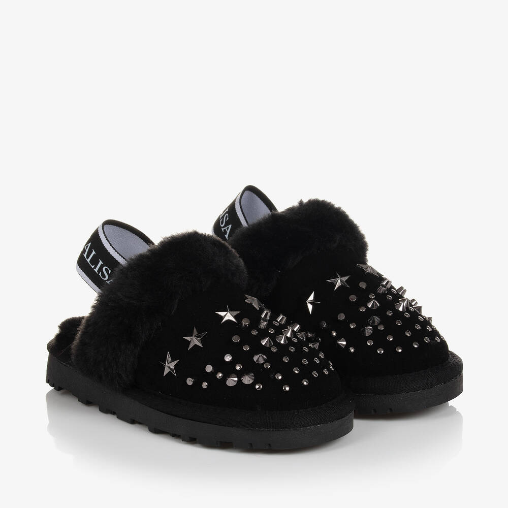 Embellished with pewter metal stars and studs for an edgy look, these black suede leather slippers for teen girls are by Monnalisa. Lined in super soft faux fur, they have a matching faux fur trim and non-slip rubber outsoles for good grip. For designer appeal as well as a secure fit, there is a branded black and white elasticated strap at the back.