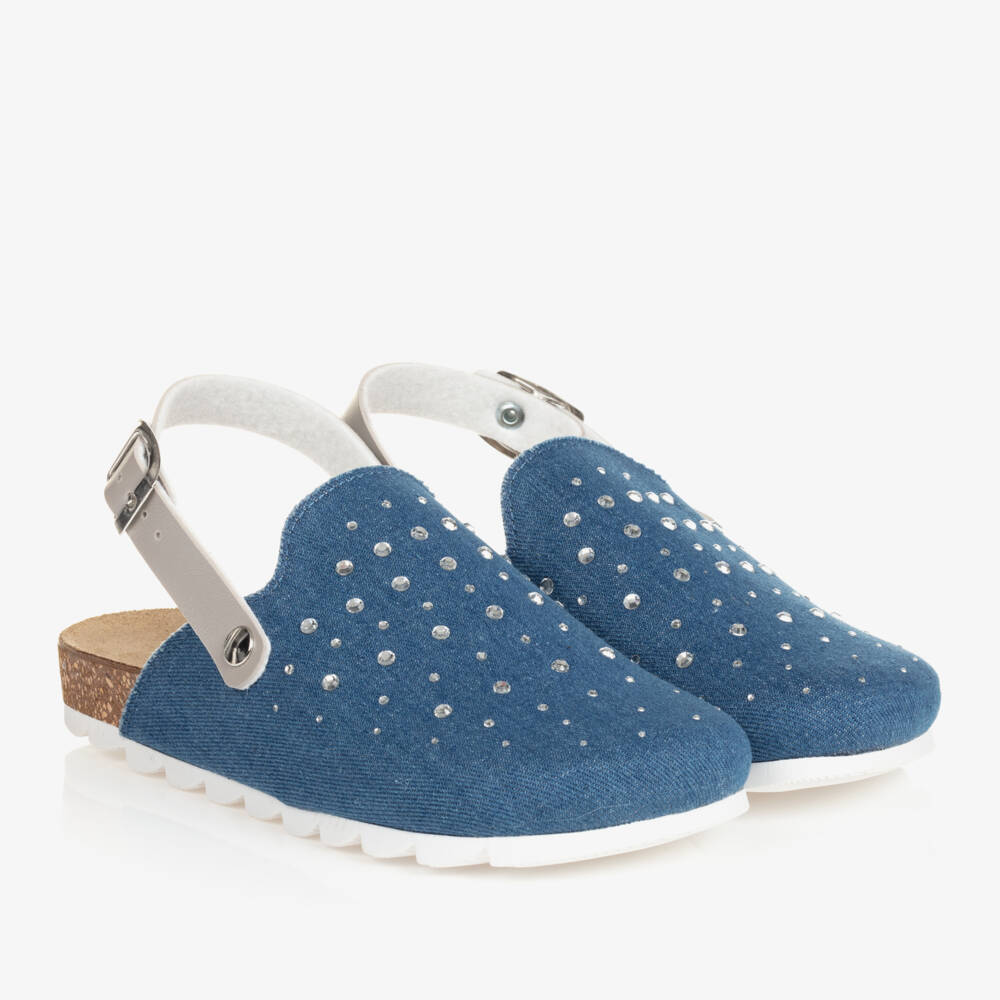 Designed by Monnalisa, these blue denim sandals for teen girls are great for a laid-back look. Decorated with diamanté embellishments for added sparkle, they have a silver faux leather strap that fastens with a buckle on the side. Complete with smooth suede leather insoles and soft textile lining, they have ridged white non-slip rubber outsoles for a cool finish.