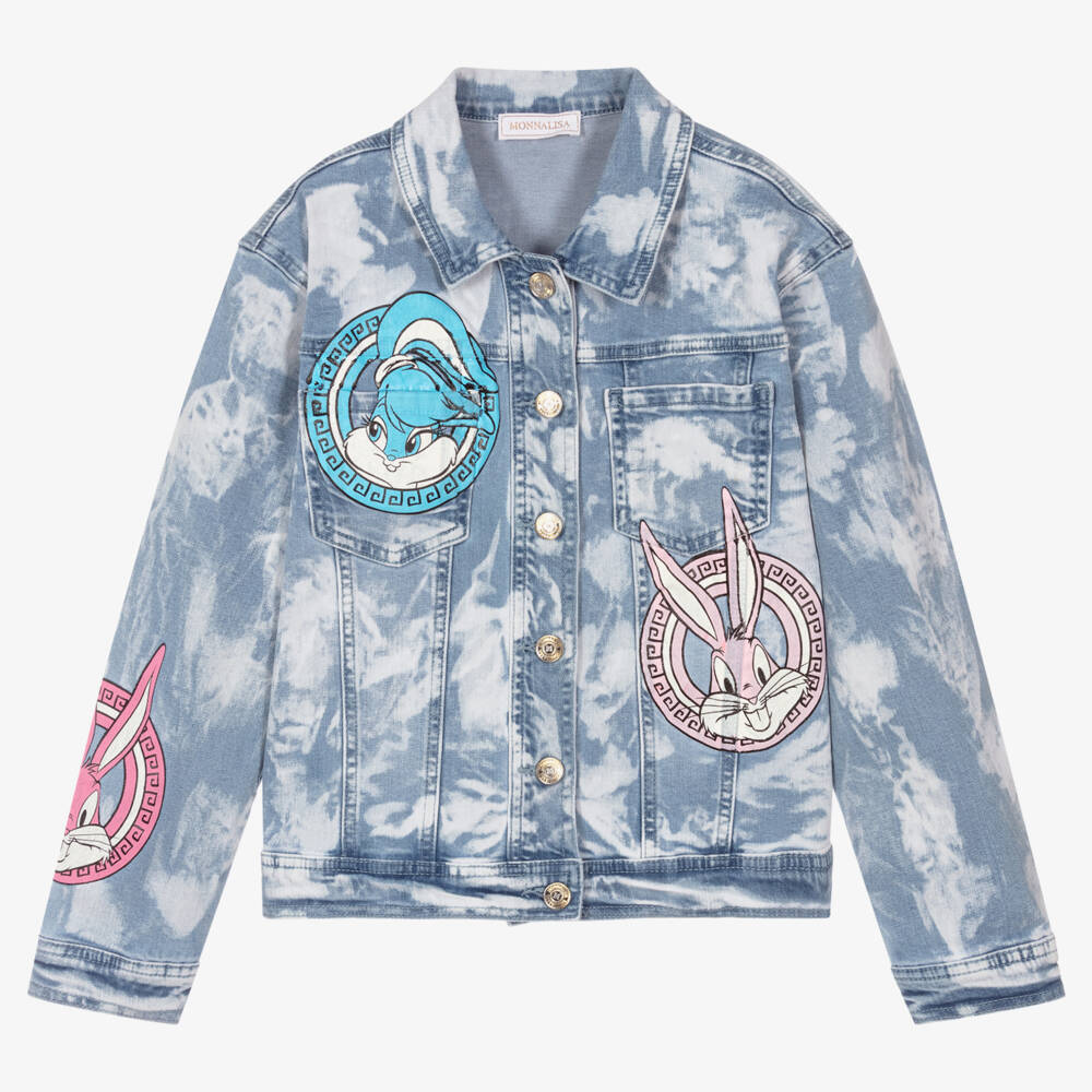 Blue denim jacket for teen girls by Monnalisa, with an edgy bleached effect. With stylish gold and silver logo embossed buttons, it has a colourful Bugs Bunny and Lola print with Greek key detailing for a fun, casual look.