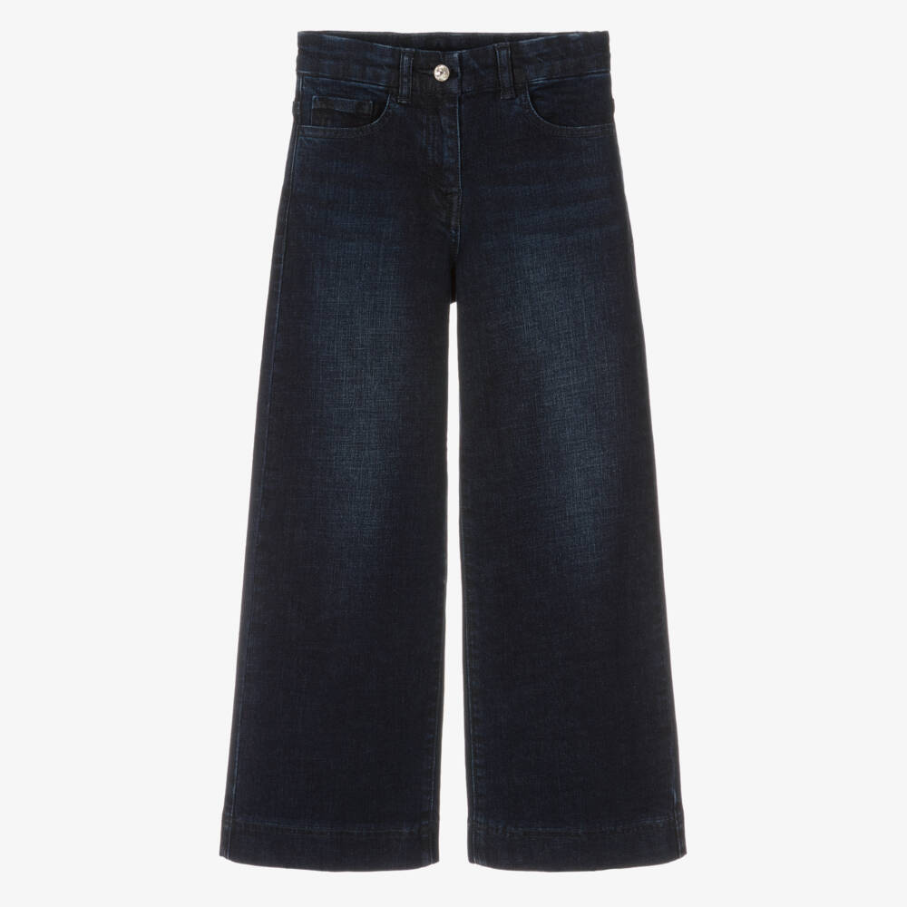 Dark blue denim jeans for teen girls by Italian brand Monnalisa. Infused with a 70s vibe, these wide leg jeans have five-pocket detailing and useful belt loops for an authentic jean look. Soft and durable, they fasten with a sparkly button and a concealed zip closure on the front. The high-rise waist creates a beautifully feminine shape and the pink glittery logo tab on the back adds a pop of colour.