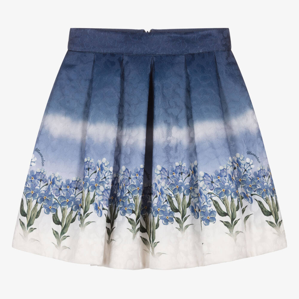 Full and pleated, this flouncy blue and ivory skirt for teen girls is by Italian designer Monnalisa. Made in a cotton-blend, animal-print jacquard, it has a beautiful floral pattern around the hemline, with subtle logos. The skirt has a soft twill lining with tulle frills to give extra volume, and fastens with a neat, concealed zip around the back.