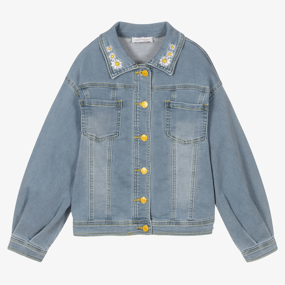 Cool light blue denim jacket for teen girls by Monnalisa, made in soft jersey with the look of denim. With delicate embroidered daises on the collar, it has a fun embellished Tweety on the back, pleated cuffs, and contrasting yellow stitching.