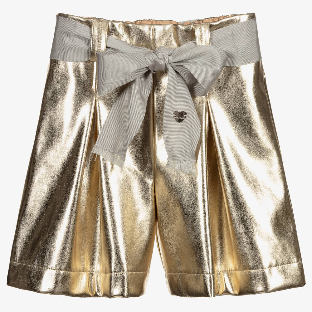 Fabulous gold shorts with that wow factor for teen girls by Italian designer Monnalisa. Made in shiny, lightweight faux leather, they have inverted pleats on the front and come with a removable beige grosgrain sash. The waistband is elasticated around the back for comfort and there are useful concealed side pockets.